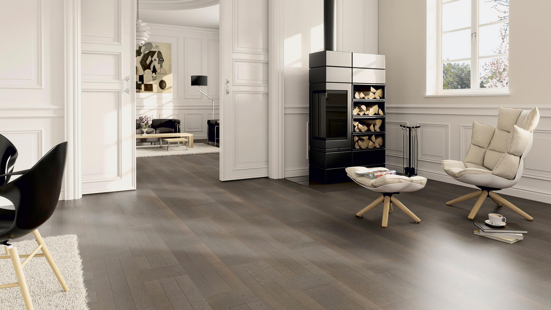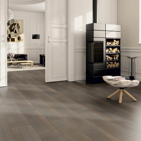 Трехполосная паркетная доска со специальными фасками из коллекции «Contours» создают неповторимый рисунок пола. Фаска подчеркивает каждую ламельку, из которой состоит паркетная доска, и создает неповторимый рисунок. Обработка щеткой и натуральным маслом дополнительно подчеркивают каждую доску. Результат - высококонтрастные акценты и эксклюзивный рисунок.